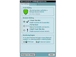 虽然Netscape 8是基于Mozilla.org的成功并且大部分都是基于安全的Firefox浏览器的,但是Netscape中也包含了IE的引擎代码,从而使得这个浏览器具有高度的通用性并且能够正确的显示专门为IE而优化的代码。Netscape可以在Firefox浏览器和IE之间自动切换,从而消除了那些针对不同网站而展开不必要的争论,也就是哪一个网站使用哪一种引擎更好的争论。无论在什么时候,如果Netscape使用IE进行浏览,它都会使用一个内部的白名单来提高它的安全性--这个白名单是通过TrustE认证的、被认为具有较好的安全性的网站。